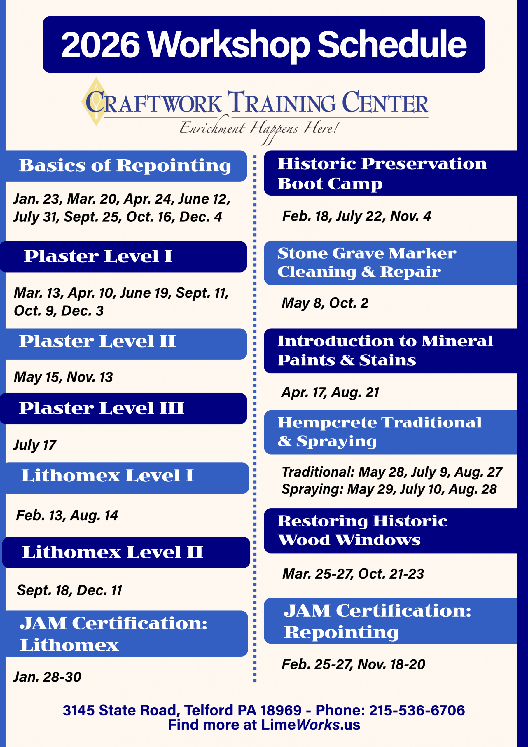 The Craftwork Training Center at LimeWorks.us is proud to announce our 2026 schedule of hands-on workshops—a full year of opportunities for tradespeople, preservation professionals, and passionate homeowners to strengthen their skills, connect with the craft, and build confidence in traditional materials and methods.